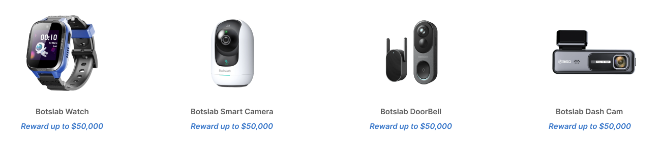 This program targets Botslab smart devices. We sincerely invite security experts to join the program.You will be provided with free testing devices and rewards up to $50,000USD.